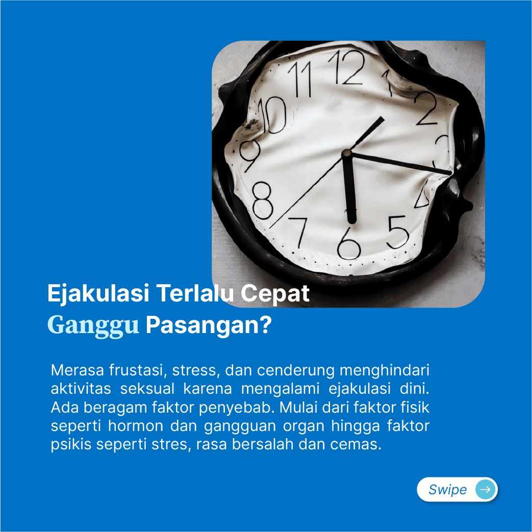 Cirinya adalah sperma keluar dalam satu menit setelah penetrasi dan tidak terkendali di hampir setiap aktivitas seksual. Ejakulasi dini bisa membuatmu frustasi, stress, dan cenderung menghindari aktivitas seksual. Masalah ini berhubungan dengan kondisi psikis, seperti kecemasan, rendahnya kepercayaan diri dalam melakukan aktivitas seksual, adanya kejadian traumatis di masa lalu seperti kekerasan seksual, dan lain-lain. Terapi untuk ejakulasi dini sangat beragam mulai dari terapi perilaku, krim anestesi, hingga obat-obatan yang memerlukan resep dokter.