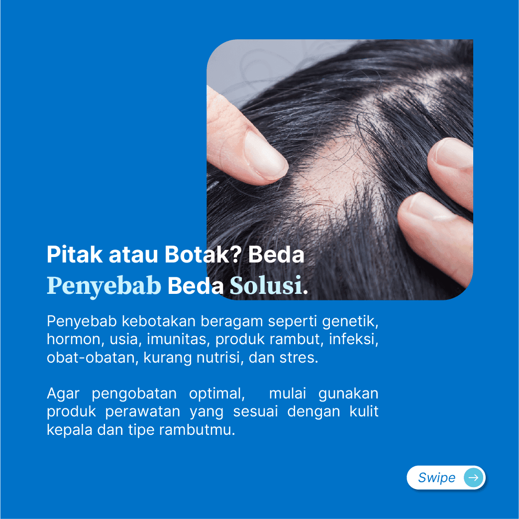 Hilangnya rambut hingga menjadi botak dapat terjadi pada keseluruhan kulit kepala maupun beberapa area saja (pitak). Penyebab kebotakan beragam seperti genetik, hormon, usia, imunitas, produk rambut, infeksi, obat-obatan, kurang nutrisi, dan stres. Selain dengan obat luar, misalnya serum dan shampoo, kamu mungkin membutuhkan obat minum. Agar pengobatan optimal, segera konsultasi dan mulai gunakan produk perawatan yang sesuai dengan kulit kepala dan tipe rambutmu.