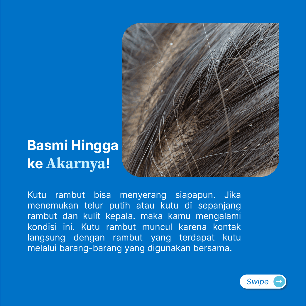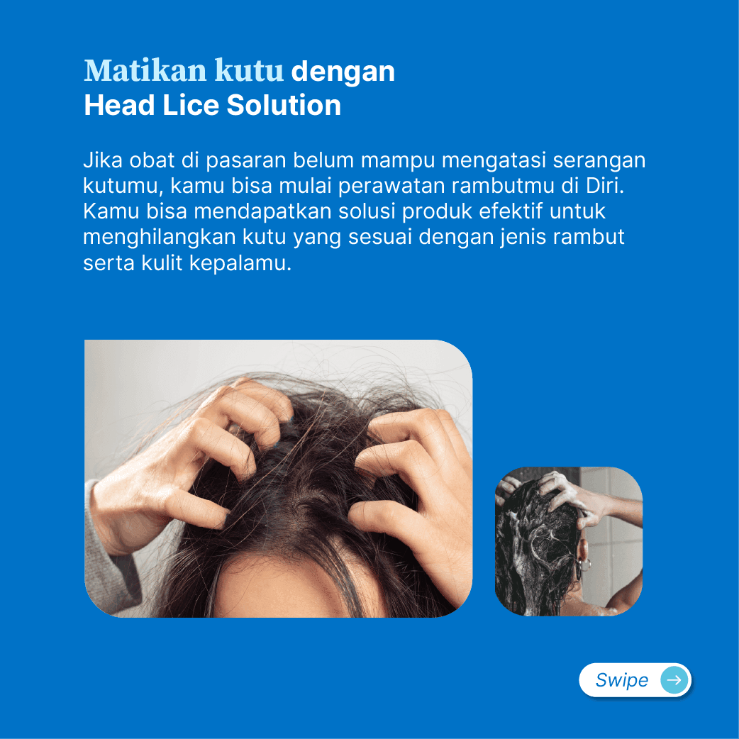 Jika terserang kutu, kamu akan menemukan telur putih atau kutu di sepanjang rambut dan kulit kepala diiringi oleh rasa gatal. Ini tentu akan sangat mengganggu hari-harimu. Kutu rambut muncul karena kontak langsung dengan rambut yang terdapat kutu melalui barang-barang yang digunakan bersama. Jika kamu belum berhasil menghilangkan kutu rambut, pakailah produk pengobatan yang efektif di Diri dengan bimbingan dari Dokter ahli.